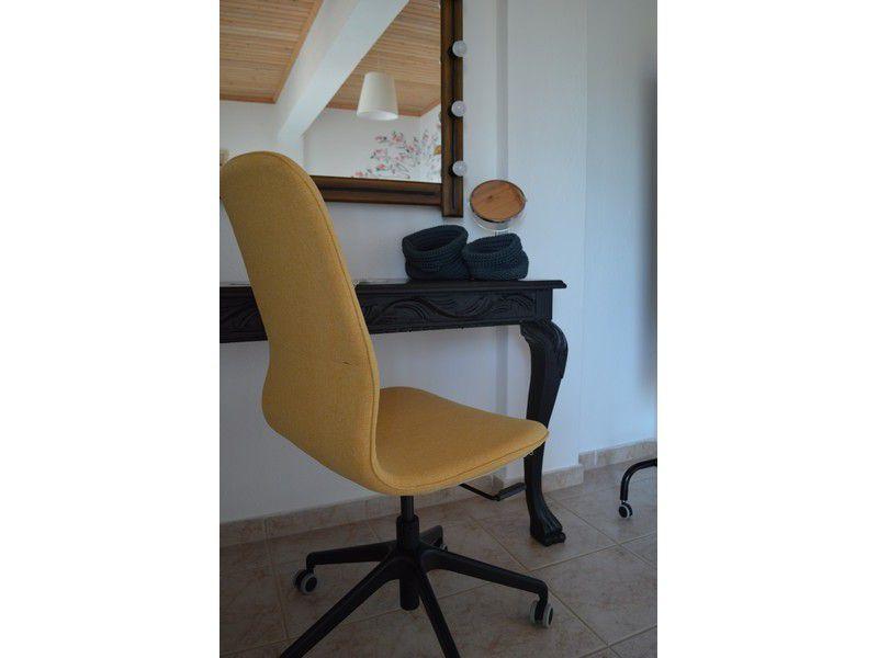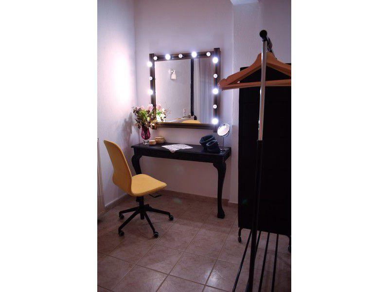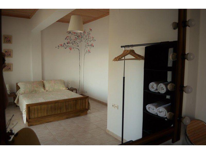 Στο μπροστά υπνοδωμάτιο υπάρχει διπλό ξύλινο vintage κρεβάτι , μπουντουάρ τύπου καμαρινιού και μια μοντέρνα κρεμάστρα για τα ρούχα.